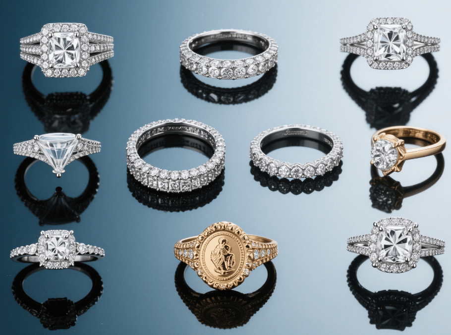 - Engagement rings : Typically featuring diamonds or other precious gemstones